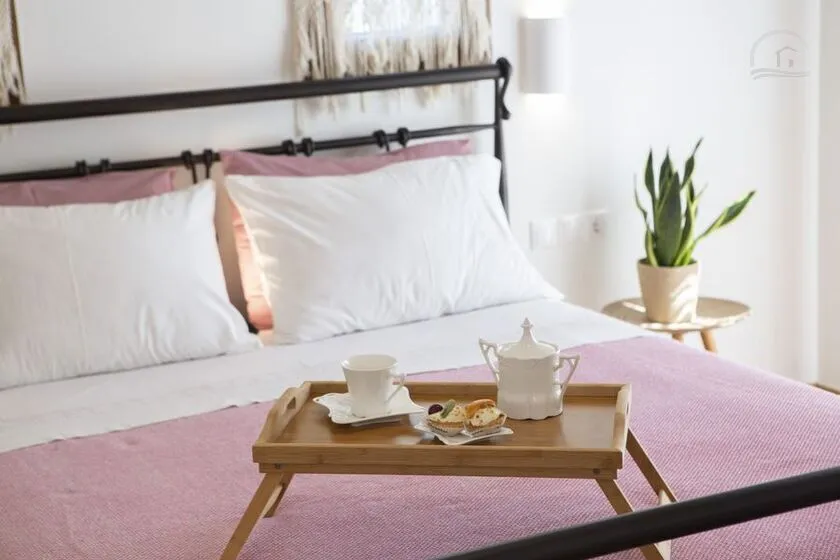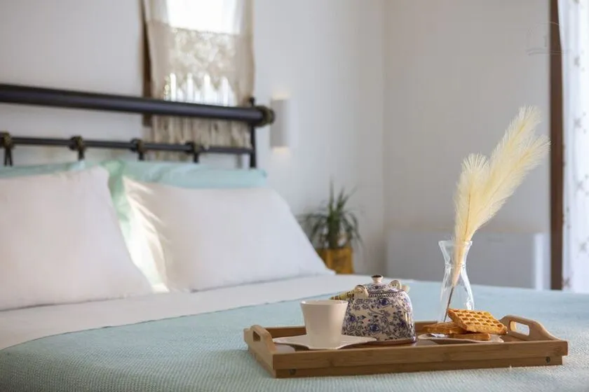 As you enter the villa, on the ground floor you are found in the comfortable living room, decorated with small handmade vintage ornaments, with a sofa that can be turned into a single sofa bed. The romantic fabrics and light colors, warm the energy of the house, giving a cottage feel and a welcoming sensation. The open layout of the living room and the kitchen makes the room wider. The kitchen with the small traditional touches, combined with the full scale amenities, are offering all you need for an inspired cooking. The kitchen table will invite you to drink your coffee and have fun, while you gaze at the green garden. On this floor you also find a double bedroom, dressed in handmade embroideries and high quality linen, plus one bathroom with shower.